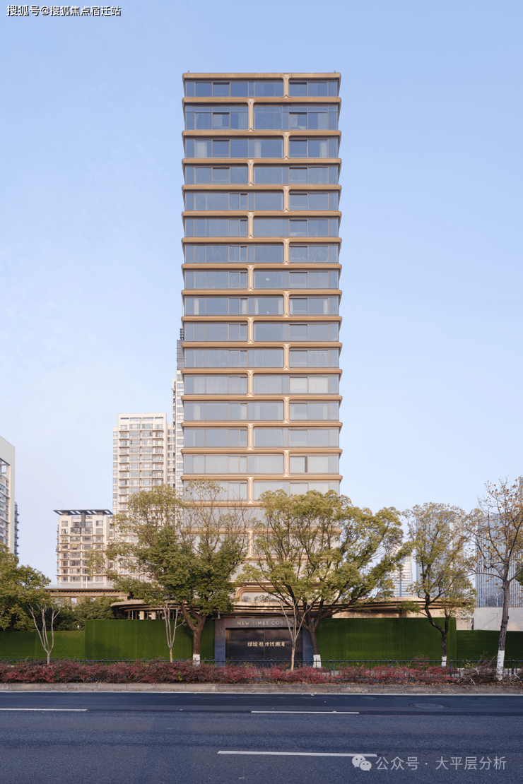 外立面以金色铝板曲面线条呼应钱塘潮涌,搭配三层中空LOW-E玻璃幕墙