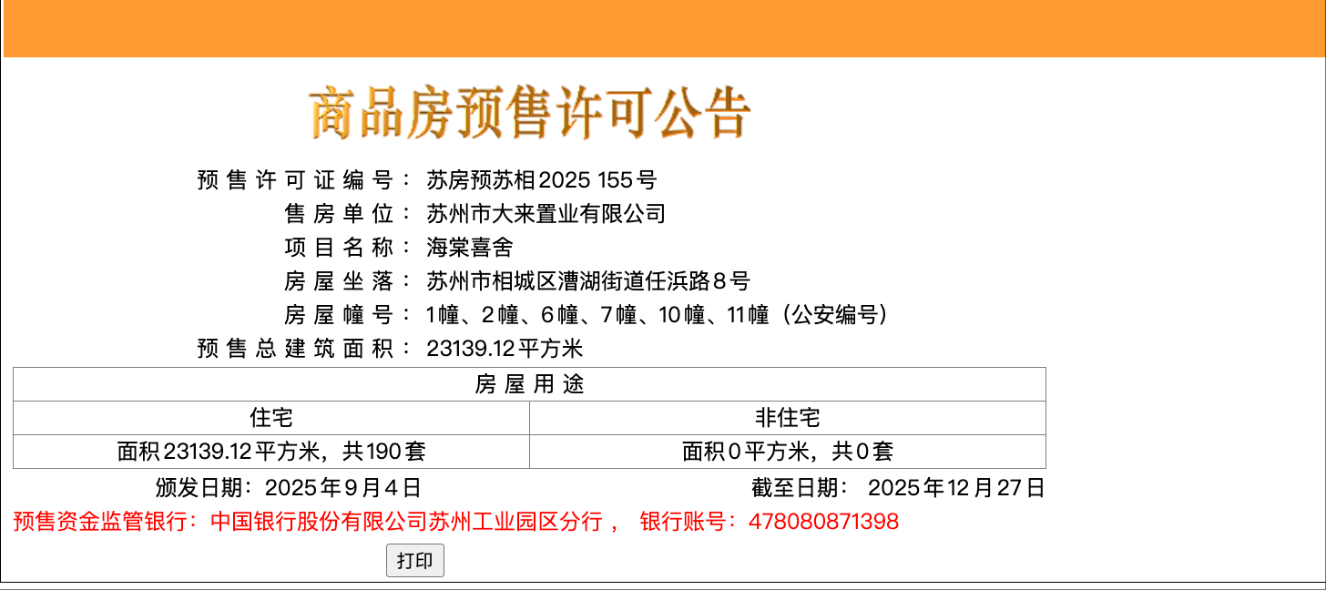 海棠喜舍,即苏地2021-WG-52号地块,位于苏相合作区五星路东、昌南路北,是2021年9月土拍中,建屋以总价约16.5亿竞得,成交楼面价12500元/m²。目前项目规划未出,根据地块指标来看,容积率>1.0且≤1.8+限高60米,后期可能打造洋房+高层产品。按照土拍要求,全装修交付,装标不低于1500元/m²。