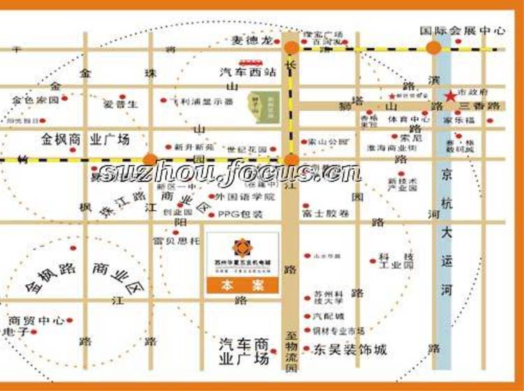 苏州华夏五金机电城是苏州市重大招商引资项目和重点工程,座落于长江路中段,规划用地400亩,一期占地210亩,总投资规模15亿元。是一座集研发、贸易、会展、物流、服务、休闲、文化旅游等功能于一体,苏州地区较大的五金机电产业流通服务平台。苏州华夏五金机电城地理位置得天独厚、交通便捷,毗邻苏州乐园、苏州高新开发区、苏州科技大学。距苏州火车站8公里、汽车西站2公里;距上海虹桥国际机场80公里、浦东国际机场120公里;距上海港100公里、张家港90公里、太仓港70公里、常熟港60公里;沪宁高速公路、苏嘉杭高速、312国道、京沪铁路纵横穿越;直达上海的轻轨即将开通,距市场约500米。