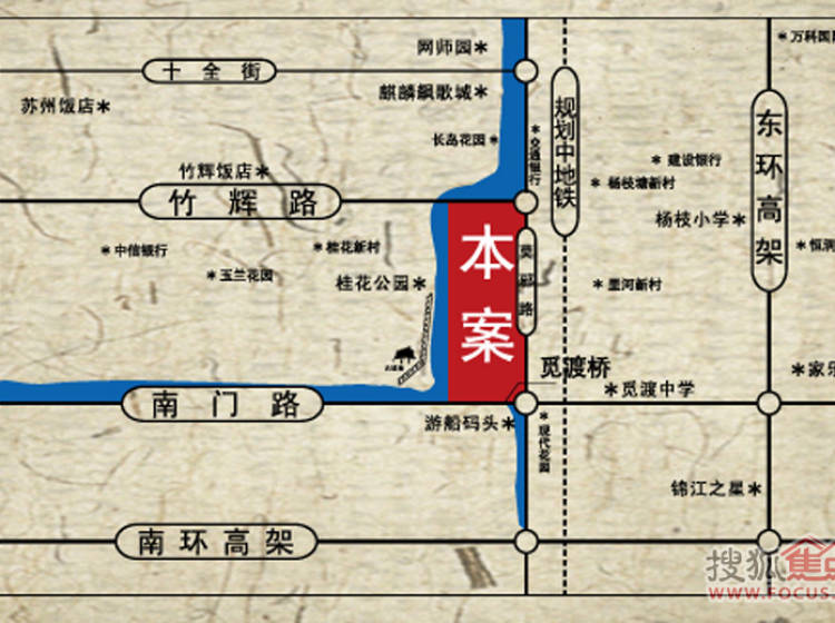 苏州·新天地商业街地块位于苏州市沧浪区内。地块西临苏州古城护城河并与护城河内环古城风貌带中的旧城堞影和觅渡揽月两大景点遥遥相望;地块东沿以苏州历史上著名的铸剑大师姓名命名的莫邪路。南望代表古代造桥工艺的历史古桥觅渡桥和代表现代造桥技术的新觅渡桥。