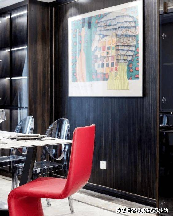 黑白对比的餐桌,几何的线条让氛围显得更加沉稳。为了更加贴合主人的生活习惯,除了红色座椅之外,还搭配了灰色透明的座椅,表现出空间主人对时尚的追求。
