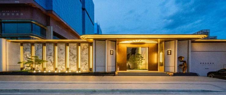 门头气势恢宏。做了约80米宽,6.5 米高。大门材质用的是熔铜,入口处还设置 25 米长叠级水景承托整个入口,沉香米黄、蓝翡翠潘多拉等多种名贵石材搭配,每平米光石材成本就是近万元。