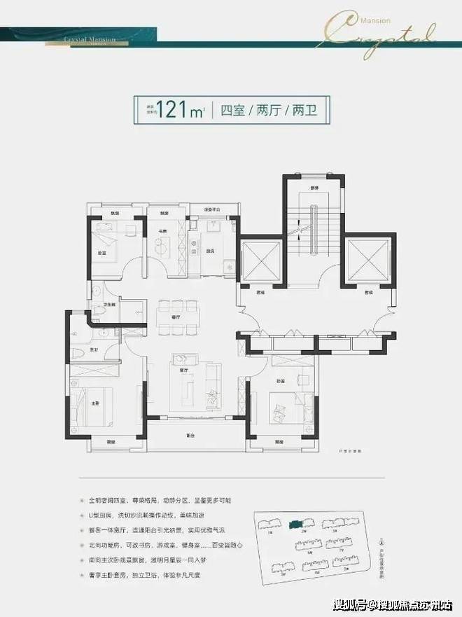 约121平四室两厅两卫,三开间朝南,全卧飘窗,约4.8米面宽客厅,结合超大观景阳台,使客厅的空间感增强,采光效果更好,宽敞气派。