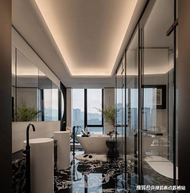 卫生间地面的宝格丽黑石材,与白色的基调形成鲜明对比,造就空间层次与品质。