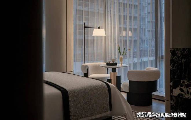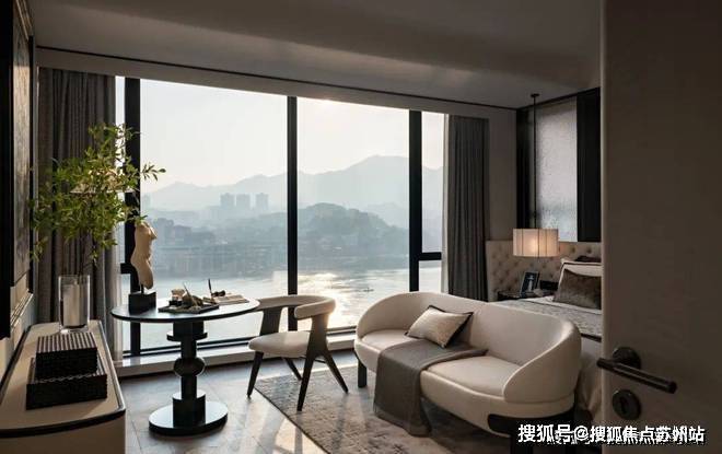 主卧以柔和的灰白色调为基底,陈设的点缀恰如其分。落地窗前,一张休闲椅与小圆几静静伫立,成为欣赏江景的美好角落。生活在此,成为一场永不落幕的风景。
