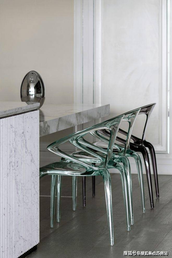 就餐厅暂离传统的固定设计方式,采用更新颖的设计方法缔造潮流惊喜。餐桌联合岛台,扩展用餐面积,赋予更加灵动洒脱的形态。另外通透亚克力支柱呈现的隐身姿态,赋予空间更温馨淡然的氛围。