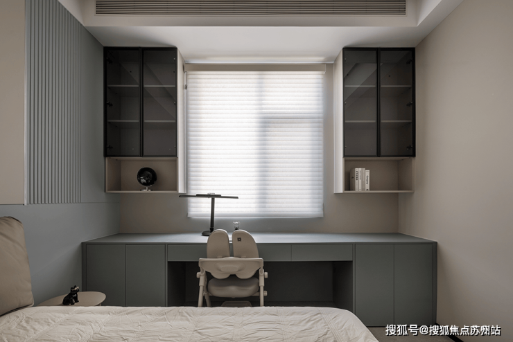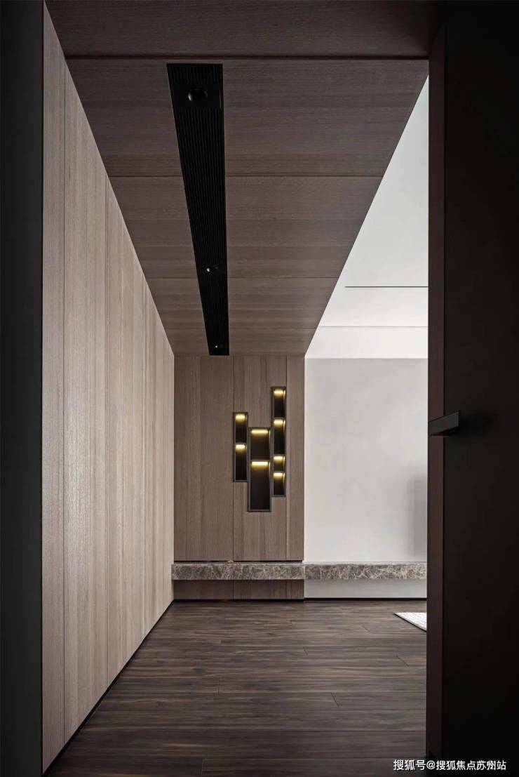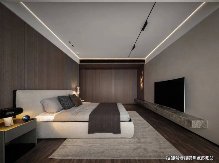 主卧空间的整体色调比公共区域暗了一调,胡桃木饰面的灰咖色成了这里的主色调,希望这个暗调空间可以让主人更快地进入梦乡。灯光设计上选用了一些暖色的线性照明,既提供了柔和的照明环境,又体现了现代的科技感。