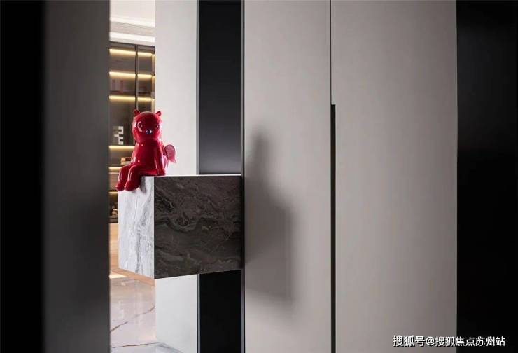 该户型没有入户的玄关空间,进门便是正对着餐桌,为了缓解这个布局上的缺憾,设计师将门厅的鞋帽柜进行体块化穿插设计,利用凸出体块形成悬空的端景,视觉上界定入户的第一个视觉焦点,而这里摆放了艺术家张占占的PUPU熊,红色的小熊十分治愈,让归家的人看到它会忘掉疲惫和烦恼。