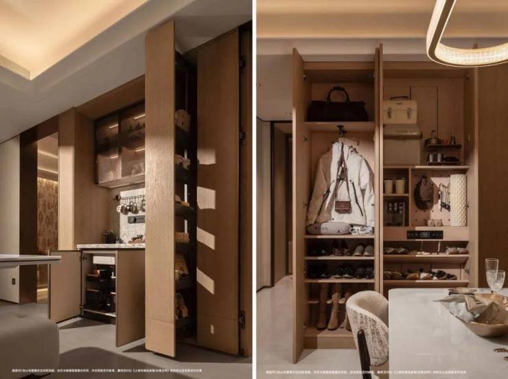 全屋定制柜体,其中就连120㎡户型收纳容积约14600L,行李箱、换季被褥、杂物全藏起来。