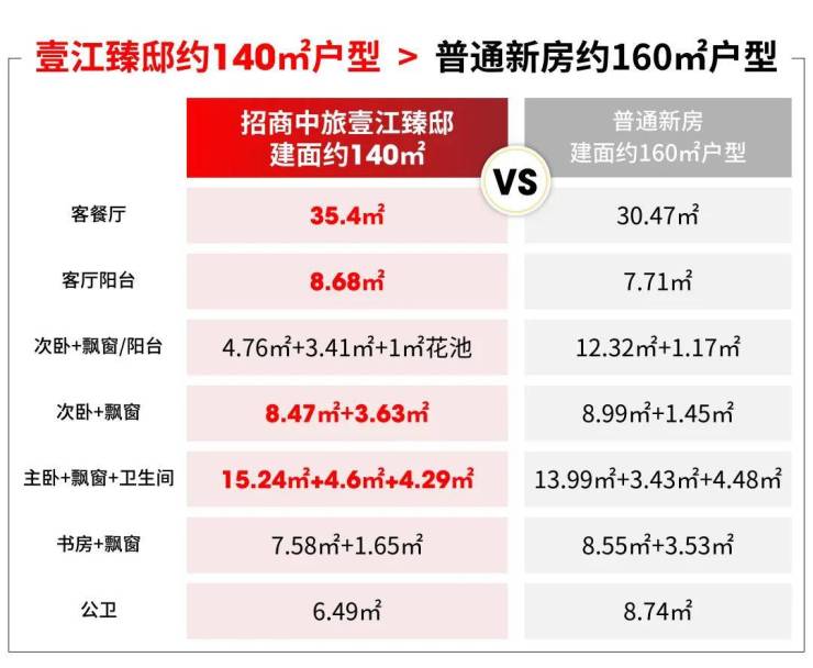 在与建面约140㎡左右的大4房的对比中,壹江臻邸客餐厅、客厅阳台、主卧、公卫的空间都更大。