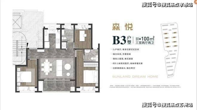 建面约100平3房2卫,则适合三代一孩家庭、可满足三代居的功能要求;