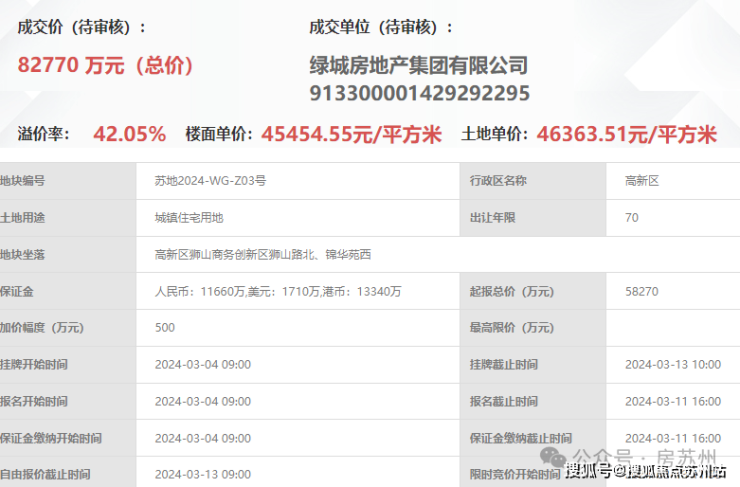 今年3月的土拍中,绿城以总价约8.28亿抢下该地块,成交楼面价45455元/㎡,溢价率42.05%。