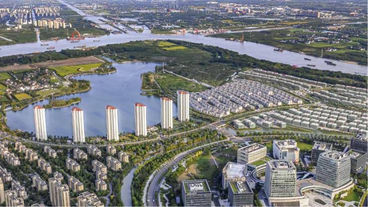 黄浦江从东、南两面环抱整个兰香湖社区,东北侧有兰香湖作为水系中心,钥匙形的外观寓意“以智慧之钥,开启生活之门”。