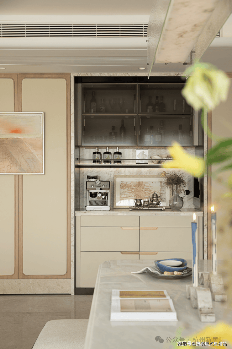 餐厅中,云石与琉璃共舞的吊灯,晕染出温润光域.几何烛台与玻璃花器于低语呼应,共呈舒适与精致并存的用餐场景.餐边柜静立于侧,咖啡的氤氲与酒香交织,将寻常三餐,升华为仪式感的盛宴.