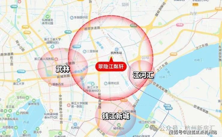 翠隐江粼作为千万豪宅,具备“内外兼修”的气质,但在地段上也丝毫不逊,地处武林广场、钱江新城、江河汇三角交汇中心位置.项目紧邻地铁4号线新风站,直线距离D1口约50m,区别于安琪儿双高架的阻隔,这里更开阔,真正做到远离高架又便捷各大交通枢纽.
