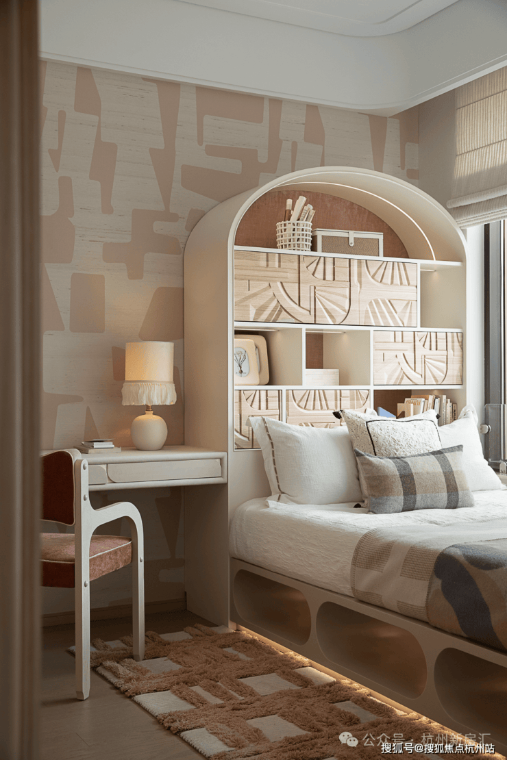 女孩房以粉白色为调,营造童趣唯美的成长天地.床体与收纳柜一体设计,弧形顶柜兼具收纳与装饰功能.飘窗,成为安顿身心的精神角落.展卷小憩或凭窗静思,皆可于熟悉的日常中,抵达诗意栖居的真意.