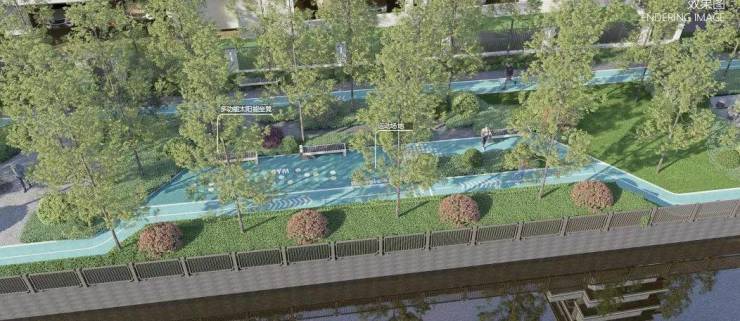 除了内部景观外,项目还借景古塘河,为业主打造约2600㎡水岸公园,含水杉树阵、绿地草坪、400米跑道及健身设施等。