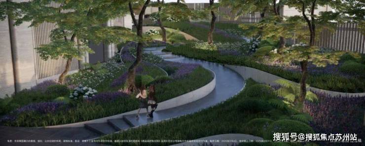 通过景观设计,将小区景打造成了立体台地花园,设置缓坡、下沉式花园、台阶等,让整体景观表现出立体层次感,错落有致。