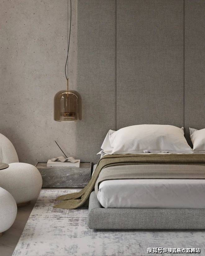 卧室中灰色的主色调与客厅相呼应,柔软蓬松的白色床品为屋主打造出了一个温馨舒适的休憩空间,床头柜选用灰色大理石,上方的床头灯则是金属与玻璃,不同材质的搭配让空间显得更加精致,富有美感.落地窗前的小沙发与茶几,能够让屋主在这度过舒适的下午茶时光.