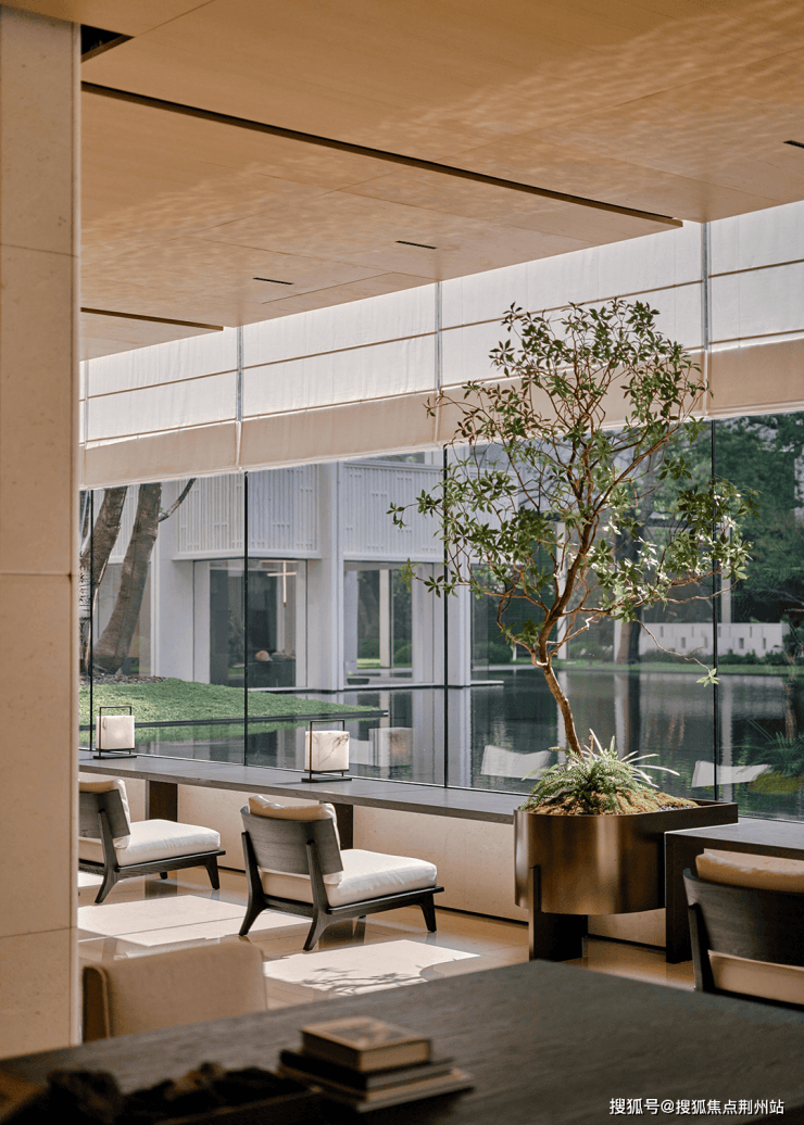 开阔视野将庭院景致无缝衔入室内,葱郁绿意成为空间里鲜活的画作.风摇叶动,光影随之起舞;雨落窗棂,自然韵律轻叩心扉,模糊了内与外的界限.光在此停驻,风在此徘徊