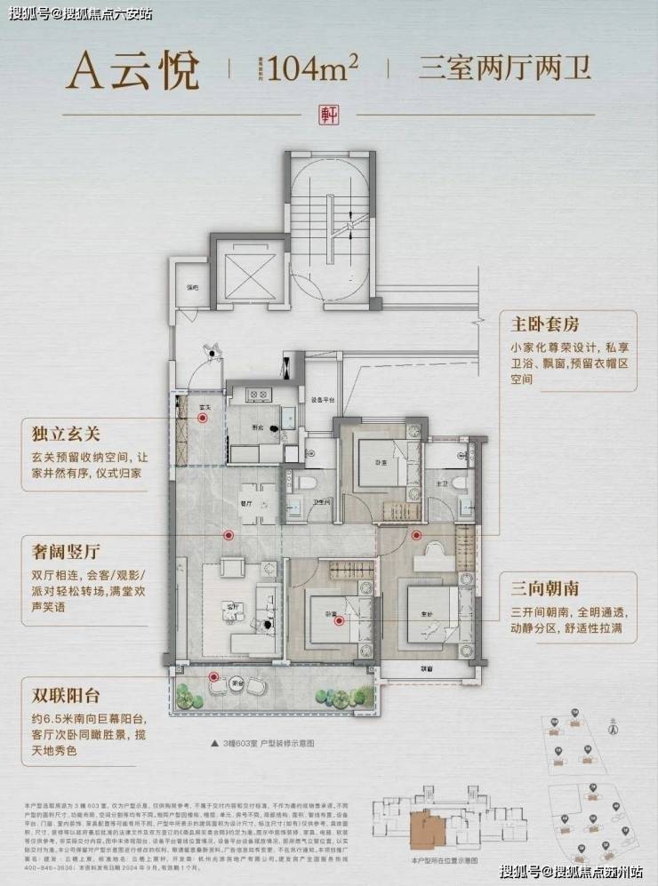 - **104㎡三房**:6.5米双联阳台+主卧套房,玄关整墙收纳柜,隐私性凸阳台设计。