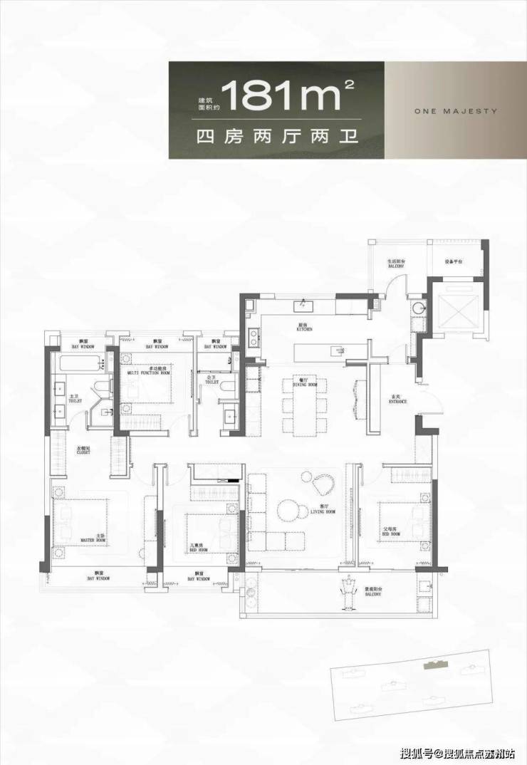 181㎡的户型做了四房两厅三卫,虽没有200+的看上去开阔,四开间朝南设计、南向双阳台,整体功能性很强。