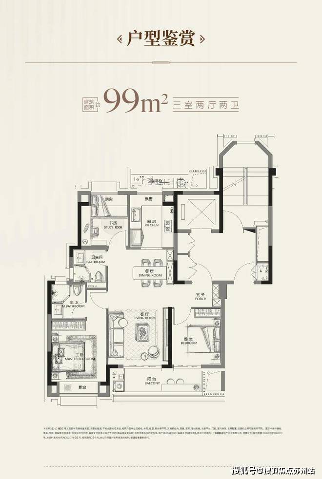 该户型为项目入门级产品,采用经典的“燕镜户型”设计,南北通透,得房率约78%。南向三面宽达9.6米,主卧与次卧均带飘窗,U型厨房连接约6㎡服务阳台。亮点在于可变空间设计,书房可通过墙体改造与次卧合并形成儿童套房。卫生间配备双台盆和电热毛巾架,细节体现人性化考量。