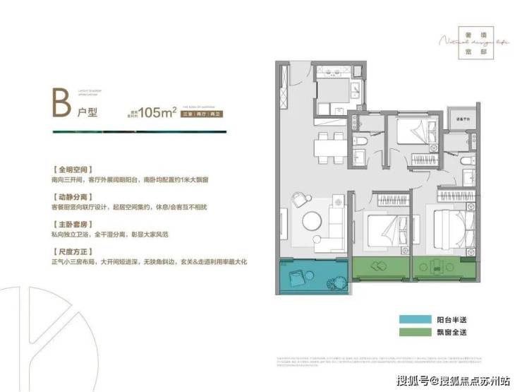 105㎡三室两厅两卫:户型方正,功能齐全,适合小家庭居住。客厅与餐厅相连,空间开阔,主卧设有独立卫生间,生活便利。