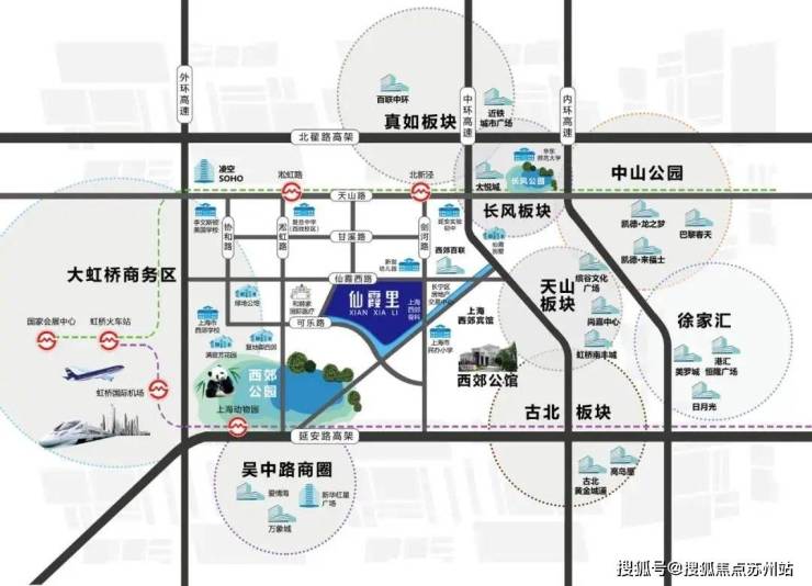 项目隶属长宁区西郊板块,毗邻 中山公园、古北、虹桥商务区。区域生活配套醇熟,地理优势明显。