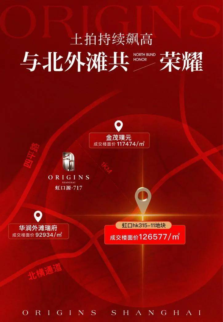 回顾北外滩土拍史,板块地价的跳涨绝非一时喧嚣,而是一步一个脚印,走出了一条漂亮的攀升曲线。2024年11月,华润置地51.36亿拿下北外滩新地块,楼面价92934元/㎡,溢价率11.97%。四个月后,金茂&庆隆以89.64亿元摘得新地,溢价率冲至38.2%,楼面价高达117474元/㎡。再到本次土拍再破纪录的126577元/㎡,每一次落槌,都是对北外滩价值爆发的坚定投票。如今虹口内环再添“地王”新丁,为本就热势难挡的“四平路三兄弟”再加一把“火”,豪宅扎堆,成为上海置业圈内新的热议话题。