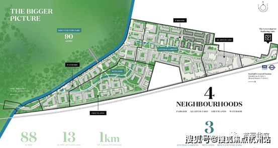 GreenQuarter项目由英国著名的开发商伯克利集团开发,属于大型住宅项目,主要分为4大区域,融合了3大中央花园,运河在临,为住户提供的绿意盎然的生活环境。