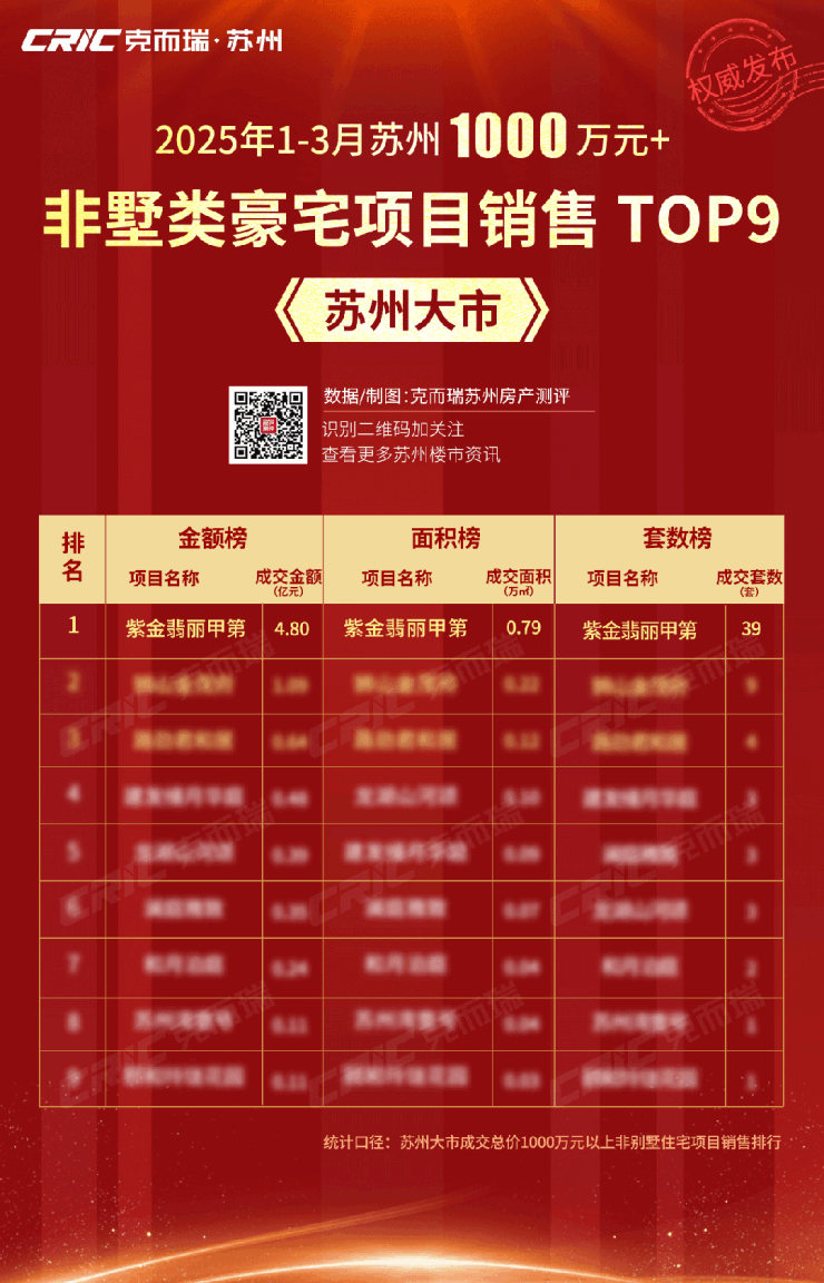 据克而瑞最新数据显示,项目横扫2025年苏州大市第一季度非墅类千万级市场销售套数、面积、金额「三冠王」,单日劲销超3000万已经是常态,以一己之力撑起了苏州顶豪市场热度。
