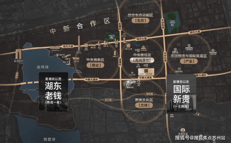 现代大道以南,是园区地标天际线+初代豪宅群落。中新大道以北,是园区最新的豪宅朋友圈+顶配资源大礼包。