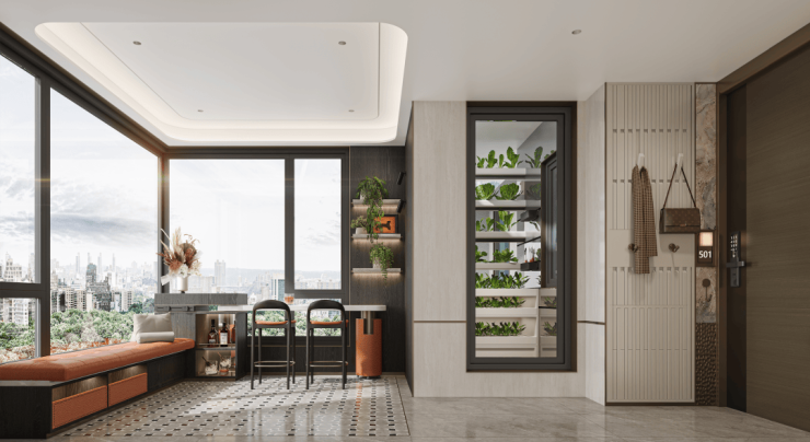 这种入户厅在其他项目是做外部玄关,但在这里是有大面积玻璃采光,12㎡空间直接升级为入户光厅+4㎡空中菜园,或天空书房茶室等,让归家的仪式感与生活的情趣完美融合。