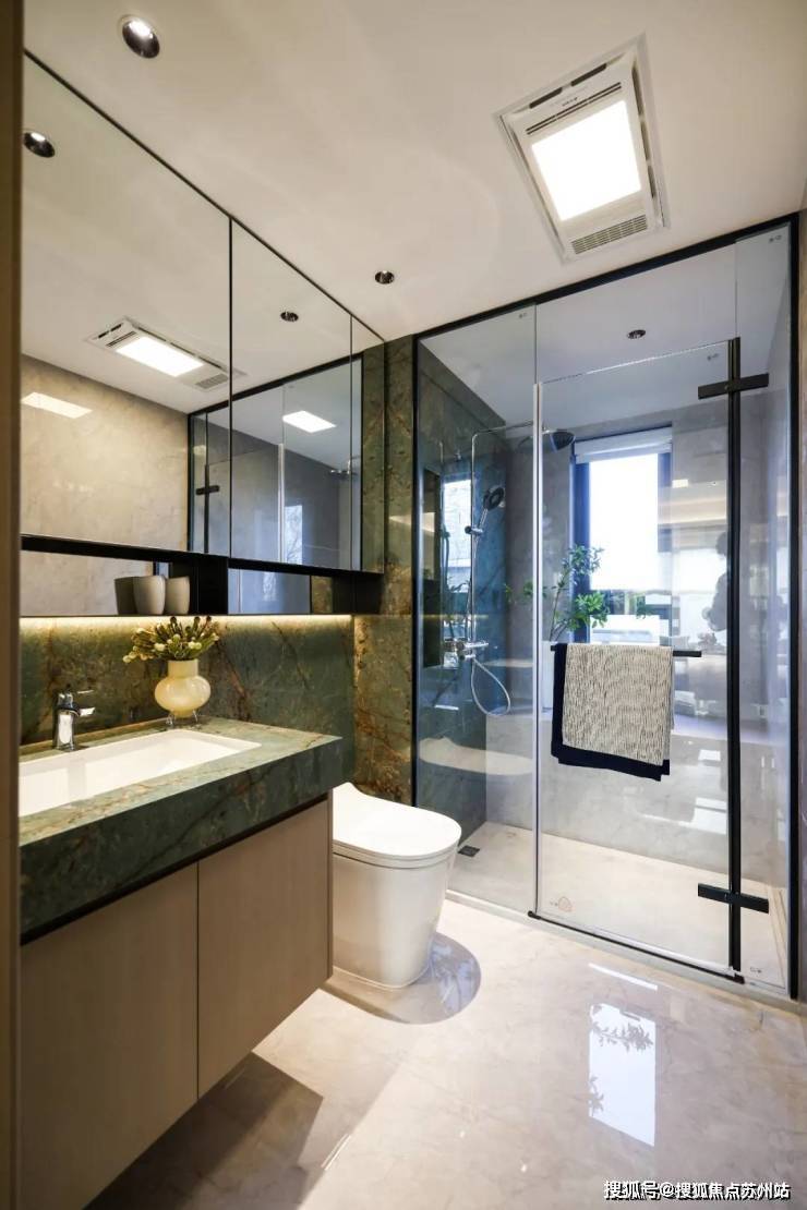 卫浴方面,采用科勒的水龙头、台下盆、花洒、星逸智能一体化马桶,艾美特的风暖浴霸等,更配置恒温花洒+滑竿+顶喷等。