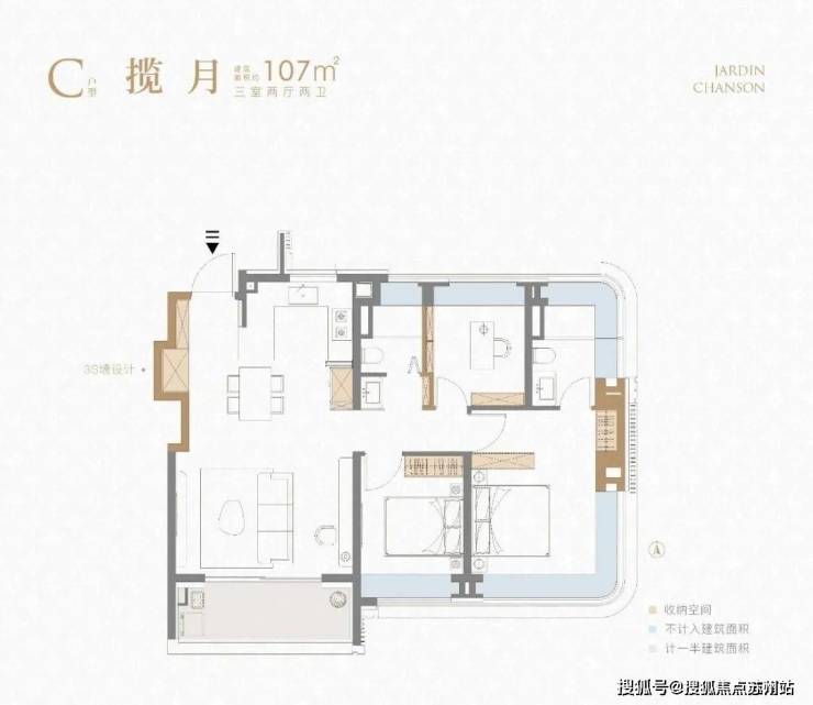 正因为如此,在同等建筑面积下,主要功能区的尺度会比常规户型大很多。比如这个建面约107㎡3房,客厅的面宽到了约4.7米!
