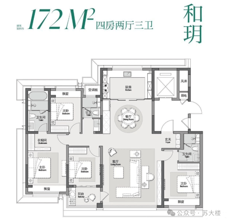 约172m²4房3卫设计,带独立入户前厅,4开间朝南,横厅开间约5.4米,客厅阳台通铺设计;2个套房,其中次卧套房开间约3.4米,主卧套房开间约3.6米。
