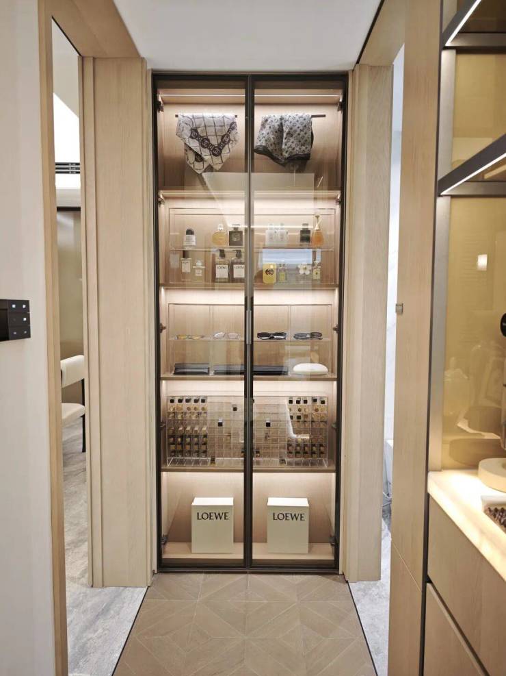与背景水纹玻璃结合既保证了,让阳光能够肆意充沛的洒落进来,也能营造出见影不见人的隐秘感!
