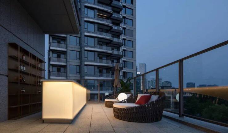 露台呈现了另一个舒适的休闲区域,通过区域感的塑造,沉浸式社交体验,让空间的平面布局与组成元素相互对话,满足动与静、开放与半开放的功能需求。