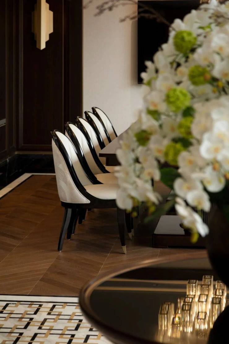 空间里多重质感交织,轻盈、鲜活的材质交错在古铜色的流光溢彩之中,配合空间布局的设计,创造华丽空间下的层次与严谨。