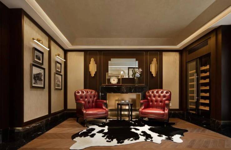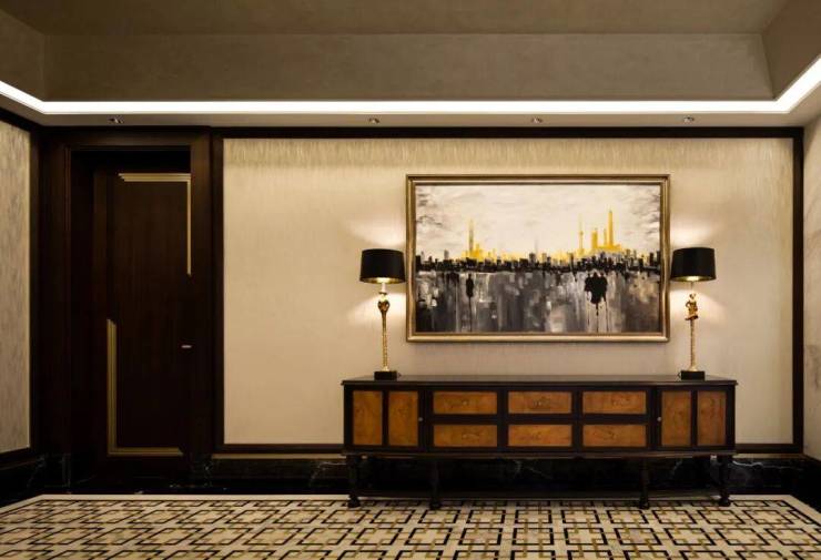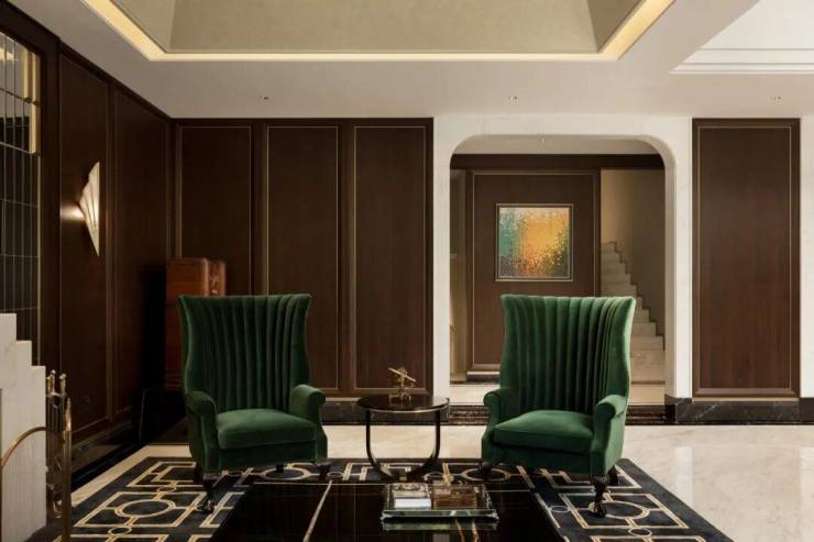 接待厅结合了恢弘的空间气韵与复古的海派奢华,典雅不失细节,大理石与金属碰撞出端庄雅致的艺术气息,赋予空间层次感,抬头可见的空间气度,精致无双。