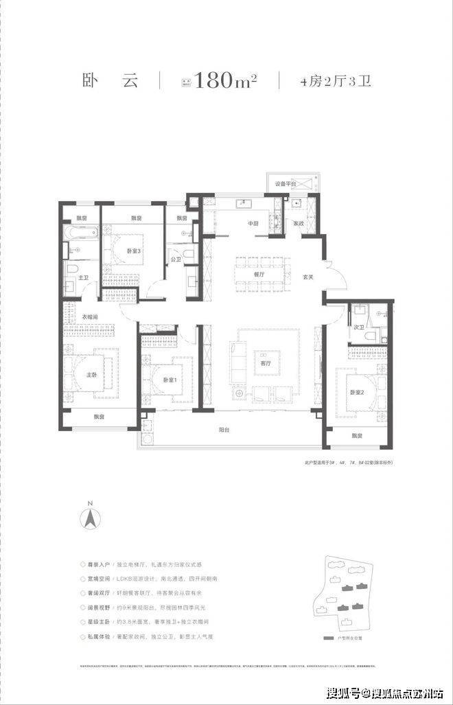 四房两厅三卫,作为洋房的得房率很高,步入样板间就能感受到。约6.95m的横厅的开阔性,南向双套房,主卧开间约3.7米,次卧约3.4米,客卫落于两个北次卧的中间,处处彰显细节。