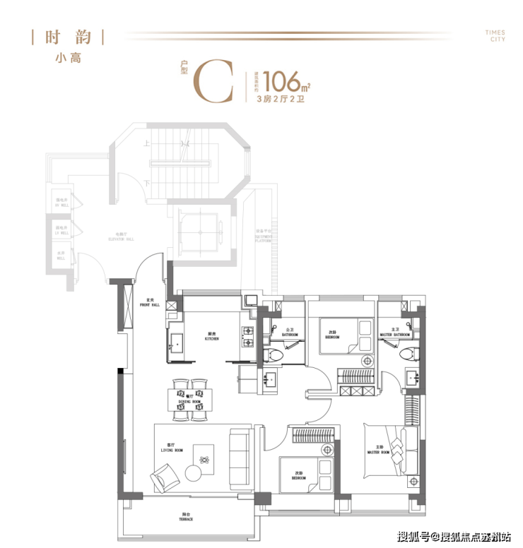 建面约106㎡3房2卫(高层)▼