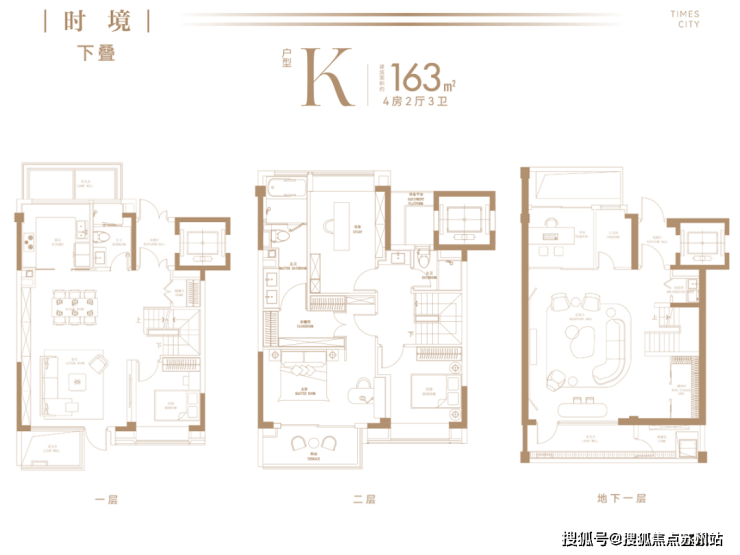 以建面约142㎡下叠为例,地上两层、地下一层阔绰空间,动静科学布局,全面考量三代同堂与二胎家庭的居住空间需求,以人性化质感空间演绎舒奢生活。