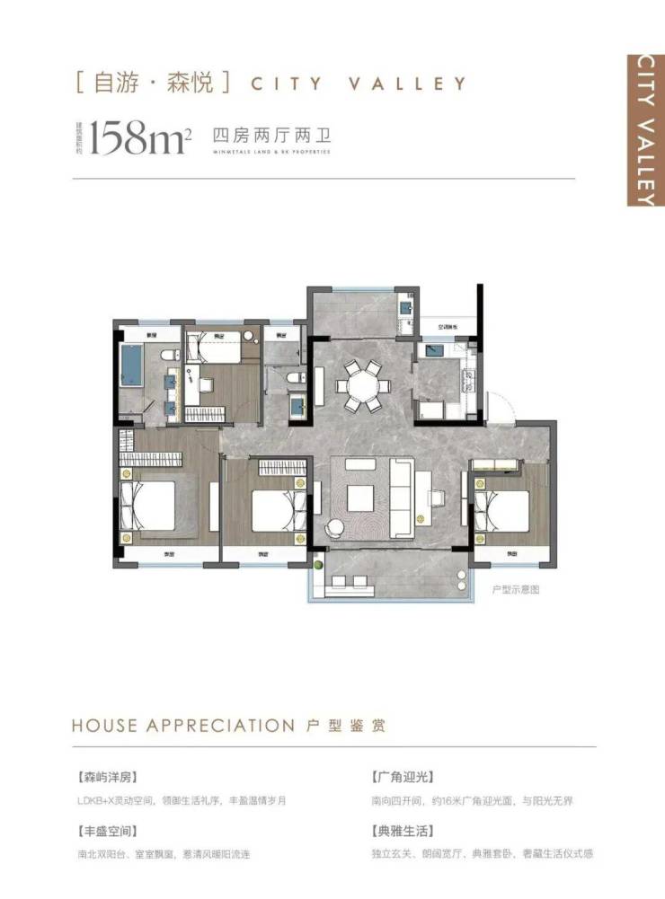 户型实用率高,三房四房一步到位 房子的户型设计非常实在。洋房的得房率能达到约82%-84%,空间利用率很高。产品线从89㎡的三房户型起步,到158㎡的四房户型,能满足从新婚夫妇到二胎家庭的不同成长阶段需求。户型方正,功能分区明确,居住舒适度有保障。