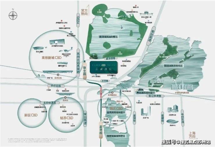 交通上,盛泽湖片区毗邻苏州高铁北站;中环北线从盛泽湖南侧穿过与苏嘉杭高速公路和227省道互通;G524国道位于盛泽湖西侧,北通常熟、南接苏州主城区东环路等。阳澄西湖南隧道已经通车,阳澄湖第三隧道正在建设中,通车后可快速抵达苏州中心。另外,板块还规划了轨交2号线和13号线,站点就在该项目西南角约450m位置。