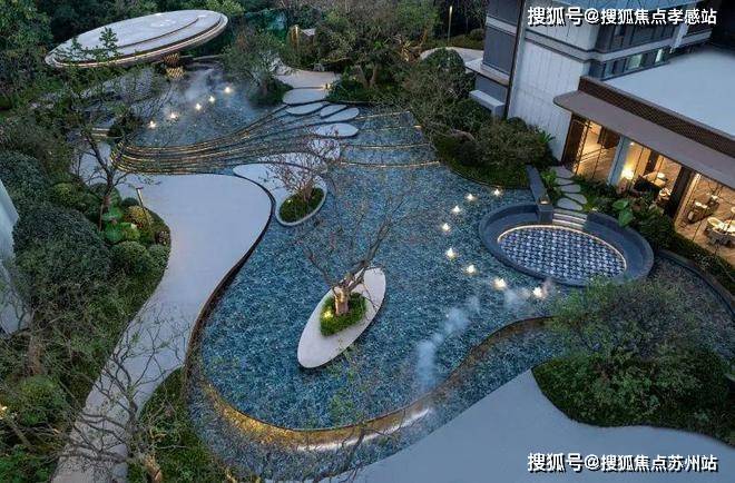 并且将中心场地抬高1米,在水系池底通铺1300多片的PRADA绿石(仿石砖)、精选斜飘乌桕、造型紫薇等名贵树种...