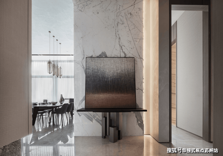 走进入户玄关,锯齿木饰面柜体低调时尚,正面鱼肚白大理石墙体带来自然的清润感。