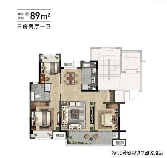 而建面约105㎡三房两厅两卫户型同样拥有独立玄关,并且空间感更为朗阔,三开间朝南,并且餐厅也设计有景观飘窗,真正做到了南北通透;一字串联的大客厅、南向阳台赋予家人更多互动空间;还有分散布局的卧室互不打扰。