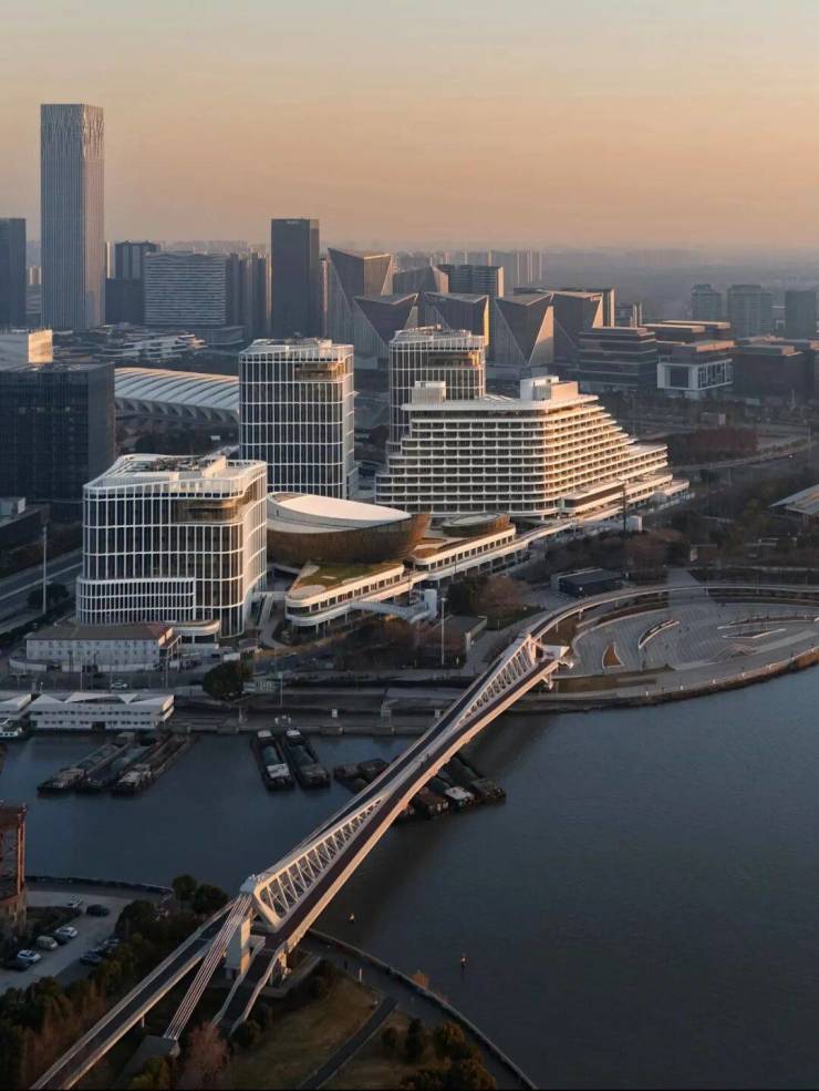 与华尔道夫酒店为邻的,是前滩源多功能演艺中心,从空中俯瞰,就像一艘大船停播在黄浦江畔,超大尺寸铝板在阳光中照应着江水涛涛。